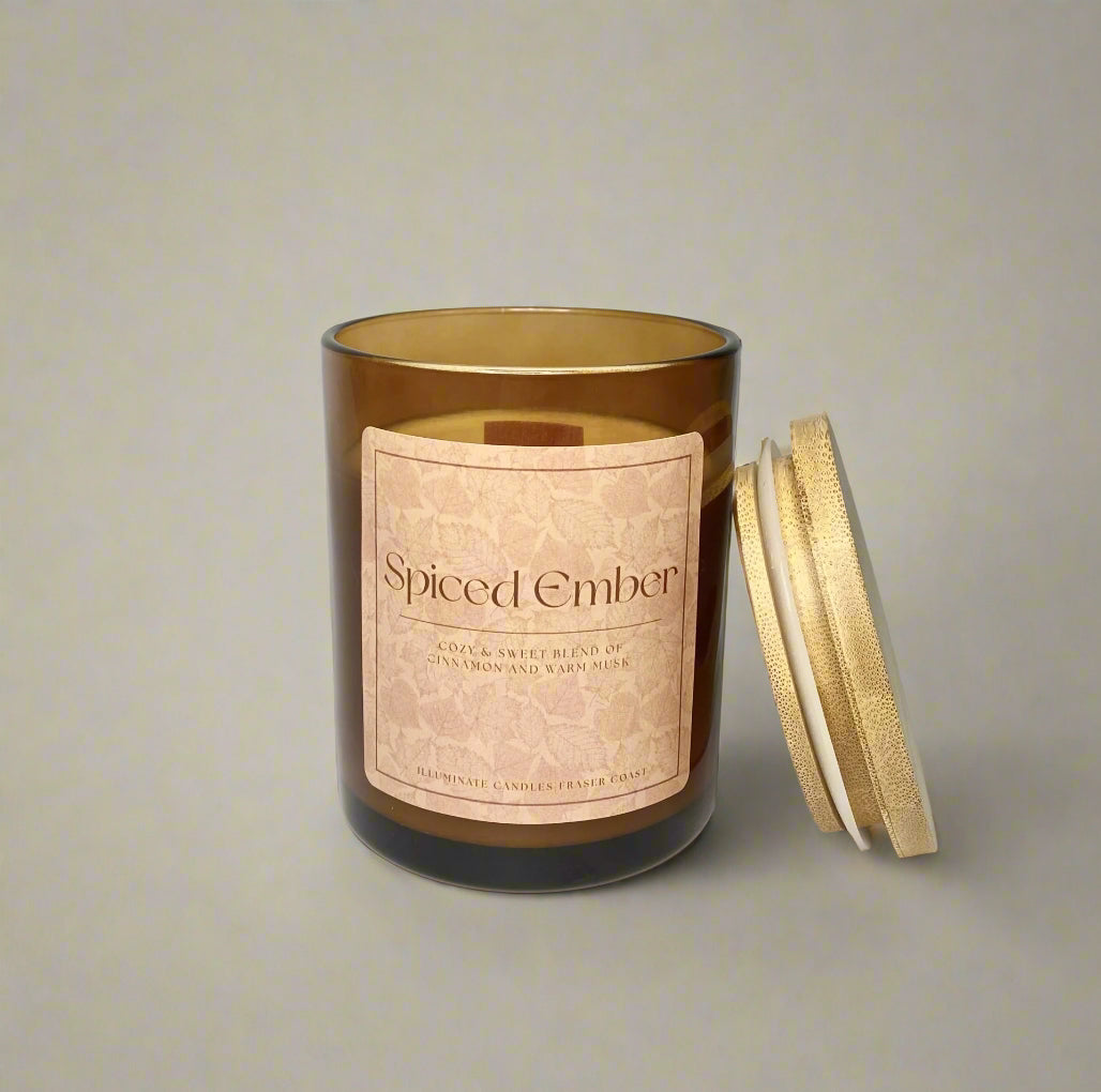 Housed in a warm amber jar with a luxe wooden wick and natural wooden lid, Spiced Ember evokes the glow of autumn nights and the quiet crackle of firelight.